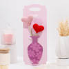 Celebrate your bond with this heartfelt couple's gift combo. It features a pink and red crochet heart hand-tied to a sleek lilac vase slate. Paired with an acrylic photo stand displaying two of your favourite pictures and the message Love You A Lot. A charming mix of warmth and elegance, this keepsake captures your love beautifully. - Material: Crochet hearts made of pure wool, photo stand crafted from acrylic with a wooden base. - Dimensions: Acrylic frame measures W 3 x H 7.7 cm, wooden base measures 7 x 3.8 cm. - Personalization: Personalize the acrylic frame with your two couple photos for a unique and romantic touch.
