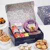 Make this Bhai Dooj truly memorable with this thoughtfully curated gourmet hamper. Presented in an elegant royal blue and gold box, it features indulgent treats to delight your sibling, rich Kaju Katli, buttery Danish Butter Cookies, crunchy Peri Peri Millet Mix, assorted sweets, and a mix of dry fruits. Completing the set is a traditional roli-chawal holder, adding a festive touch to the occasion. This luxurious hamper beautifully blends tradition and modern indulgence, making it the perfect way to celebrate the special bond you share with your brother.