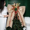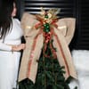 Make a grand holiday statement with this oversized burlap Christmas bow, designed to transform any doorway into a warm and festive welcome. Crafted from rich jute fabric, the bow is accented with a sleek gold ribbon and adorned with vibrant red and green ornaments, dried orange slices, golden pinecones, and shimmering gold mesh. Cascading plaid ribbons add a cheerful touch, while the mix of rustic textures and classic Christmas colours creates a stunning, eye-catching display. Perfect for elevating home entrances, events, and holiday gatherings, this decor piece brings together charm, tradition, and festive elegance in one unforgettable arrangement.