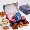 Brighten your Diwali gifting with this exquisitely styled hamper featuring rich festive elements and gourmet treats. Housed in a striking blue floral jaal box, it includes two luxury enamel canisters, Dodha Barfi, roasted almonds, peri peri almonds, salted cashews, and Thai chilli cashews. Pink metal diyas and tea lights add a radiant glow, blending tradition with elegance. Perfectly balanced between indulgence and aesthetic charm, this hamper makes a thoughtful choice for Diwali gifting.