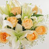 Brighten any occasion with this stunning vase arrangement featuring peach-hued roses paired with elegant white lilies. The soft tones and graceful blooms create a harmonious blend of warmth and serenity, perfect for thoughtful gifting or home decor Presented in a glass vase tied with a cream ribbon detailed in gold, this arrangement radiates refined charm and gentle sophistication. Ideal for birthdays, celebrations, or just because, this floral arrangement adds a cheerful yet classy touch wherever its placed, making it a timeless gesture of care and appreciation.