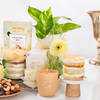 A perfect blend of nature and indulgence, this hamper will surely sway your loved ones. Nestled in a sleek acrylic tray is a lush money plant in a white blossom pot wrapped in soft off-white tissue, exuding freshness and charm. Accompanied by a moonlight candle for a calming ambience, a jar of rich fruit cake, and a wholesome Masqa healthy dry fruits mix. This hamper is finished with delicate yellow mini gerberas and white roses. Tied with a luxurious gold tissue ribbon, this thoughtful curation radiates serenity and warmth, making it the ultimate heartfelt gift.