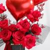 Captivate your partner’s heart with a gift that speaks pure romance. A sleek black box bag overflows with lush red roses and red-sprayed limonium, creating a bold and elegant expression of love. Wrapped in fine black net and tied with a red suede ribbon, every detail reflects passion and care. Two red heart-shaped foil balloons, each 10 inches, rise above the arrangement to complete the look with a touch of playful charm. Perfect for anniversaries, it is a stunning gesture that turns your special day into an unforgettable memory.