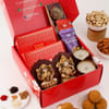 A hamper designed to enhance your traditional Diwali festivities. Nestled in a red eco-friendly box, this hamper includes roasted and salted cashews and almonds, two metal candles, besan laddoo, incense sticks, a puja kit, and a Laxmi and Ganesha Idol Set. The puja essentials included ensure you can religiously celebrate Diwali with your loved ones. You can also gift this hamper to your friends and family, wishing them a prosperous Diwali.