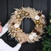 Embrace rustic holiday charm with this beautifully crafted Christmas arrangement. Soft, feathery pampas grass pairs elegantly with golden Christmas balls, creating a warm, festive glow, while dried orange slices add a natural, citrusy brightness. A dried peony brings a touch of vintage elegance, and classic pine cones lend earthy texture and winter richness. Thoughtfully composed in a circular wreath form, this arrangement blends cozy, organic elements with subtle festive sparkle, making it a refined seasonal accent for any home.