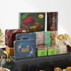 Win the hearts of your loved ones on their special day with this exquisitely curated hamper of baklava and a delightful chocolate treat. Arranged aesthetically in a black tray are six pieces of assorted Lebanese Baklava, Paan Raisian Dragees, Teekhi Chat, Almond Crunch Cookies Tin, Chana Balls in a potli, nine pieces of assorted Truffles, and Almond Dragees paired with nutritious almonds and cashews in tin packaging. These exotic sweets hamper will thrill their taste buds and hearts. The black tray will come in handy to store things even after all the delicacies are finished.