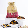 Delight your bhaiya bhabhi's taste buds with this hamper of delicious laddoos and rakhis. This pair of bhaiya bhabhi rakhis studded with pink semi-precious stones and pearls is meticulously handcrafted by skilled artisans. The rakhis are accompanied by mixed dry fruits and mixed berries packed in a pink and golden potli and paired with nine pieces of assorted laddoos and adorned in an intricate silver finish metal basket. Along with the rakhi, you will also receive roli-chawal and silver finish pooja thali so you can perform the ceremony with ease.