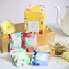 Immerse yourself in the warmth and charm of Tea Time Treasures. Wrapped in pastel lemon yellow scallops and adorned with yellow mini gerberas and white roses, this elegant ensemble sets the stage for serene moments and joyful gatherings, perfect for savoring quiet moments or sharing life's simple pleasures with loved ones. With the goodness of a floral infused tea box, chocolate cookies, nutty chocolate popcorn, choco nut energy bar, black pepper cashews,per peri almonds Tea Time Treasures captures the essence of comfort, making it the perfect gift for any special occasion.