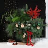 Celebrate the season with this lush and woodland-inspired Christmas arrangement filled with texture, freshness, and festive charm. A generous mix of evergreens including spruce, pine, and feathery fern foliage, creates a full forest-like display that immediately sets a warm holiday mood. Vibrant red berries bring a striking seasonal contrast, while dried orange slices and classic pine cones add a touch of rustic warmth. Green baubles lend a soft festive sparkle, and the clear glass vase finished with a simple red ribbon completes the look. This arrangement captures the essence of a cozy Christmas forest and makes a stunning centerpiece for gatherings or a thoughtful nature-inspired gift.