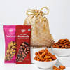 This Raksha Bandhan, tie a remarkable rakhi on your brother's wrist and surprise him with flavoursome treats using this stunning hamper. Handcrafted meticulously by skilled artisans, this Navratna rakhi features nine gemstones, each with a celestial significance. To complete the celebration on a sweet note this hamper comes with Swiss milk chocolate infused with honey and almonds it also includes Thai chilli cashew nuts and peri-peri almonds packed in a beige potli having brocade work. Along with the rakhis, you will also receive roli-chawal for performing the ceremony with ease.