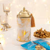 Let your loved one get started with their Diwali celebrations on a happy note. Arranged in a beautiful metal jali tray, this hamper includes a scented candle, a diffuser, a canister, two packs of black pepper cashews, and a greeting card. The candle and diffuser emit a delightful lily and honey scent, creating an inviting ambience perfect for festive occasions. The canister features beautiful gold-coloured patterns and can be reused. Gift this hamper to your loved ones, wishing them a prosperous Diwali.
