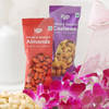Step into a realm of indulgence with this stunning arrangement, where elegance meets gourmet delights. Gracefully adorning this display are stunning purple orchids, their petals a testament to nature's beauty and sophistication. Complementing the floral elegance is the fiery crunch of peri-peri almonds, adding a spicy kick to the sensory experience. Alongside, salted roasted cashews offer a savoury balance, tantalizing the taste buds with each delightful bite. Whether as a gift or a personal treat, this arrangement promises a journey of luxury and flavour that captivates the senses.