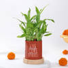 Brighten your loved ones Diwali with this celebration hamper, thoughtfully curated to bring joy, prosperity, and warmth. The serene Lucky Bamboo, nestled in a sophisticated ceramic planter with a wooden base is adorned with the words Live Laugh Love Celebrate Diwali. Paired with the rich flavours of Velvety Bar Roasted Almond and Mixed Berries. Completing the hamper is a set of four intricately crafted metal diyas, illuminating the festival of lights with their golden glow. Personalize the planter with their name and make it a forever keepsake that will always invoke festive memories.