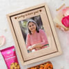 Surprise Mom with a delightful fusion of flavours and elegance in our exclusive Mother's Day hamper. The hamper contains Thai chilli cashews, offering a spicy twist to her snacking experience. Accompanying this culinary delight is a wooden rotating frame, perfect for displaying cherished memories in style. Adding a touch of floral beauty is a mini bouquet of Jumalia rose, cerise pink rose, and aqua pink rose, each bloom symbolizing love, gratitude, and admiration. Personalize the photo frame with your favourite photo and make this gift a celebration of your Mom's remarkable love and warmth.