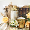 Gift the feeling of grandeur and blissfulness to your boss this boss day, and watch him smile out of appreciation. This beautiful hamper includes a golden metallic mug adorned with the words Life Is Tough But So Are You, giving him a boost of motivation every time he enjoys his favourite beverage in it. Accompanied by tasty plain cashews and dry fruit-filled dates. The hamper comes in a round metal basket with a gold floral canister, a double side frame, and a beautiful arrangement of alstroemeria, lisianthus, and roses. Personalize the frame with your boss' picture and mug with his name.