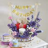 A birthday hamper designed to delight at first glance. Purple-toned blooms carnations, daisies, button chrysanthemums, eucalyptus, and dried peonies gather around a butterscotch cake and a scented candle, creating a soft, celebratory moment. Finished with a gold Happy Birthday banner, it arrives ready to display and made for gifting someone who deserves something truly thoughtful.<br>- This product includes:<br>- Carnations x 5, Daisy x 6, Chrysanthemum x 7, Eucalyptus x 4, Dry Peony x 4<br>-
