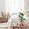 Welcome the harbinger of peace, prosperity and positivity! A wondrous and soulful peace lily plant encased in a pink metal planter. Not only does it infuse a soothing dose of nature within homes and offices but gives a leafy makeover to every sort of aesthetic. Prop it up as statement decor for a cozy corner or add to the window nooks for a greener look, it's luck and charm is sure to silhouette your loved one's home.