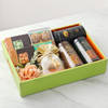 Surprise your loved ones and let them relish this wholesome Baklava and cookies hamper to their heart's content. This hamper contains a pack of Assorted Lebanese Baklawa, Chocochip Cookies Tin Pack, Almond Crunch Cookies Tin Pack, and Tea Tin Pack. Gourmet Dibbi Green Almond Dragees, Gourmet Dibbi Mango Dragees, and Chana Ball in potli are included to add a premium touch to the hamper. Everything is arranged in a Leatherite tray, which can be used after all the delicacies are devoured. Gift this premium hamper to your friends and family and make their special occasions memorable.