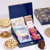 Illuminate your Diwali festivities with this elegant hamper, designed to infuse warmth and luxury into your celebrations. Featuring two beautifully crafted Pink Metal Diyas, it brings a soft, radiant glow to any setting. Enjoy the perfect balance of Plain Cashews and Plain Pistachios, complemented by the indulgent richness of MASQA Coffee Chocolate. The Tea Light Candles add a touch of serenity, while the striking Blue Lacquered Flora Box ties everything together in a stunning presentation. A thoughtful gift to express appreciation and spread festive cheer.