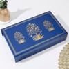 Unwrap elegance with this royal hamper brimming with gourmet indulgence. From centre-filled cookies and choco-coated almonds to classic roasted cashews and pistachios by Masqa, every bite delights. Enjoy the melt-in-the-mouth richness of Kaju Katli and the crunch of millet mixture, paired with Ferrero Rocher chocolates. Presented in a striking blue and gold keepsake box with a satin ribbon, this hamper is perfect for gifting, special celebrations, or heartfelt gestures that combine flavour, tradition, and refined style.