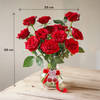 Designed to impress, this Valentine's Day arrangement features deep red blooms accented with soft green notes. Set in an elegant hourglass vase and finished with a rich red velvet ribbon bow and cherry tag detailing, it makes a refined, statement-worthy gift. - - Total No. of Stems: 14 - - Red roses - - Vase, Hourglass - - Product Dimensions - - H - 15 inches x W - 14 inches/H - 38 cm x W - 35 cm