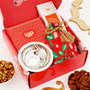 Celebrate your cherished sibling bond with this carefully crafted Bhai Dooj hamper, curated for this special occasion. This elegant box features a delightful assortment of treats and gifts, including peri-peri almonds and Thai chilli cashews for a spicy kick, traditional besan laddoos to satisfy your sweet tooth, and choco-coated almonds for a touch of indulgence. The red lotus design potli adds a touch of charm, while the silver-polished puja thali and roli-chawal complete the ceremonial aspect. The perfect gift for your dear sibling, this hamper embodies love and togetherness.