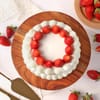 Delicate, elegant, and irresistibly inviting, this strawberry cream cake is a celebration of timeless charm and classic flavour. A smooth veil of pristine white frosting sets a refined foundation, enhanced with gracefully piped cream swirls along the top edge and base for a polished, artisanal finish. Topped with fresh, whole strawberries, the cake offers a harmonious blend of light sweetness and creamy richness, making it a perfect choice for romantic moments, cherished milestones, and intimate celebrations that call for understated luxury.