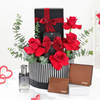A timeless gift for the man who deserves the best, this Valentine’s Day Hamper blends style and sophistication. Featuring a genuine saffiano leather dark tan wallet and card holder, personalized with his name, it is a statement of class and practicality. Complementing this is the Ajmal Carbon 100ML Men’s Perfume, a bold fragrance with citrus, cloves, woody, musk, and spicy notes for a lasting impression. Nestled in a round black striped box, adorned with red roses and a red suede ribbon. Personalize the wallet and holder with his name to make this hamper a perfect way to show your love.