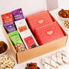 Embark on a journey of surprises with this exceptional hamper, bringing together an assortment of delightful sweet and savoury treats. Packed in a gift box, this hamper includes salted and roasted almonds and cashews, Velvety Bar roasted almonds and mixed berries chocolates, pistachios, raisins, besan laddoo, and kaju katli. This hamper is thoughtfully curated to add a touch of sweet and savoury flavours to your celebrations. Gift this scrumptious hamper to your loved ones and convey your heartfelt wishes.