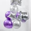 Add a touch of glamour to birthday celebrations with this elegant purple and silver balloon decor setup. The arrangement includes six purple chrome balloons, five silver chrome balloons, a large 24-inch bobo balloon, and two shining silver star foil balloons in 18-inch and 10-inch sizes. A sturdy balloon stand ensures a perfect display, while the transparent bobo balloon is adorned with a golden Happy Birthday text for a festive highlight. This stunning setup is perfect for making the occasion bright, memorable, and picture-perfect.