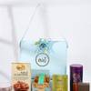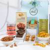 Experience a symphony of flavours with this indulgent gourmet hamper, perfect for any gifting occasion. This exquisite collection comes beautifully arranged in a reusable blue box, elegantly adorned with vibrant flower decorations. Indulge in premium salted almonds for a wholesome crunch. Savour four pieces of assorted, decadent Baklava, alongside a tin of delightful biscotti cookies. Discover savoury healthy namkeen and luxurious dragees. A Dubai kunafa chocolate adds an international gourmet touch. This thoughtfully curated hamper promises a memorable culinary journey for your loved ones.