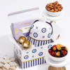 Elevate your Diwali celebrations with your loved ones with this traditional Diwali treats hamper. This elegant and thoughtfully curated hamper consists of delicious and high-quality snacks such as salted roasted almonds, berry mix, and kaju katli for them to munch on. The snacks are packed in a premium potli adorned with beautiful evil eye motifs, which they can reuse. Accompanied by two flower-shaped metal diyas, elevating your Diwali home decor most elegantly and beautifully. Perfect for gifting your family or friends on this auspicious occasion of Diwali and bringing a smile to their faces.