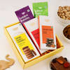 Bring a smile to your loved ones' faces with this Diwali hamper curated with love. Arranged in a yellow tray, this hamper includes pistachios, raisins, center-filled choco-cookies, Velvety Bar Roast Almond chocolate, and Velvety Bar Mixed Berries chocolate. This hamper is thoughtfully curated to add warmth and flavour to your celebrations. Tantalize your taste buds with an assortment of sweet and savoury delights. Gift this hamper to your loved ones, extending your warmest wishes for a prosperous Diwali.
