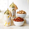 Timeless gifting calls for a touch of elegance and grandeur. This Ramadan hamper is crafted to leave a lasting impression, beautifully presented in a beige leather wooden tray. Adorned with flowing tassels, pampas grass, copper-sprayed dried peonies, gold-sprayed leather ferns, and a striking gold motif, it exudes festive sophistication. Inside, gourmet delights await, peri peri almonds and salted cashews packed in canisters. Thoughtfully designed to reflect both luxury and tradition, this hamper is more than a gift it is a statement of love, care, and celebration that they will truly cherish.