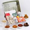 Revel in the joy of Raksha Bandhan with this grand family rakhi hamper. This comprehensive traditional rakhi hamper includes a beautiful Peacock Feather Rakhi and a charming Krishna kids' rakhi, ensuring smiles for all. An exquisite Meena and CZ Stone Work Bhaiya Bhabhi Rakhi symbolizes their bond. Indulge in delightful Chana Badam Barfi and an assorted chocolate pack of 12. Two white canisters overflow with gourmet Thai Chilli Cashewnuts, Peri Peri Almonds, Salted Roasted Almonds, and Roasted Salted Cashews. Complete with a Leafy Glow Container holding roli chawal for the tilak ceremony.