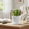 Let your home flourish with the beauty and serenity of Jade Plant In a Self Watering Planter. Jade plant acts as a natural air purifier, removing harmful toxins from the indoor air. According to Feng Shui principles, a Jade plant is believed to attract wealth and prosperity while promoting positive energy flow. This plant absorbs CO2 and releases oxygen at night, which makes it a great plant for bedrooms. Nestled in a self-watering planter, having a built-in space for water, ensuring your plant stays hydrated. Perfect for gifting family or friends to liven up their homes.
