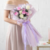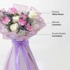 This elegant bouquet features creamy white roses, symbolizing love, and new beginnings, paired with deep purple carnations, which represent admiration, affection, and a sense of mystery. Soft limonium, known for its symbolism of enduring love and remembrance, adds an airy balance. Wrapped in pristine white tissue with a delicate lavender border sheet, the bouquet is completed with a hand-tied purple ribbon for a refined touch. Perfect for expressing affection or gratitude, this luxurious bouquet makes a thoughtful gift for anniversaries, romantic gestures, or any occasion that calls for a meaningful and timeless floral gift. - Includes: - White Roses, Purple Shaded Carnations, Limonium - Lavender Border Sheet & Purple Tissue Ribbon.