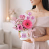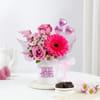 Brighten someone's day with this charming gift combo featuring a beautiful floral arrangement, heart-shaped chocolates, and a white ceramic mug adorned with the uplifting message 'You're Doing Great. The encouraging message on the mug adds a thoughtful touch, while the vibrant flowers bring freshness and warmth to the mug arrangement. Elegantly wrapped in soft lilac tissue and finished with a pink polka dot ribbon, the mug arrangement enhances the overall charm of the gift. Perfect for gifting on birthdays, anniversary or special occasions. - Total No. of Stems: 3 - Deep Purple Roses, Dark Pink Gerbera - White Ceramic Mug - Heart-Shaped Chocolates - Lilac sheet & Pink Polka Dot Ribbon